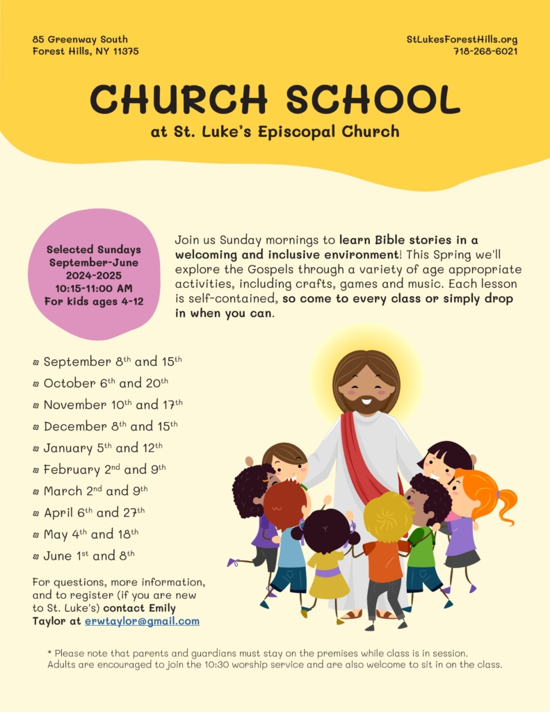 SEPTEMBER-JUNE: All children of school age are invited for faith formation and fun as we explore Bible stories, sacraments, the seasons of the Church year, service to others, and the teachings of Christ through a variety of age-appropriate activities and discussion. Older children and teens are encouraged to participate as classroom helpers (this is a great way for high schoolers to fill volunteer hours!) and we also extend a warm welcome to neuro-diverse kids and young adults who would benefit from a more informal Church experience.